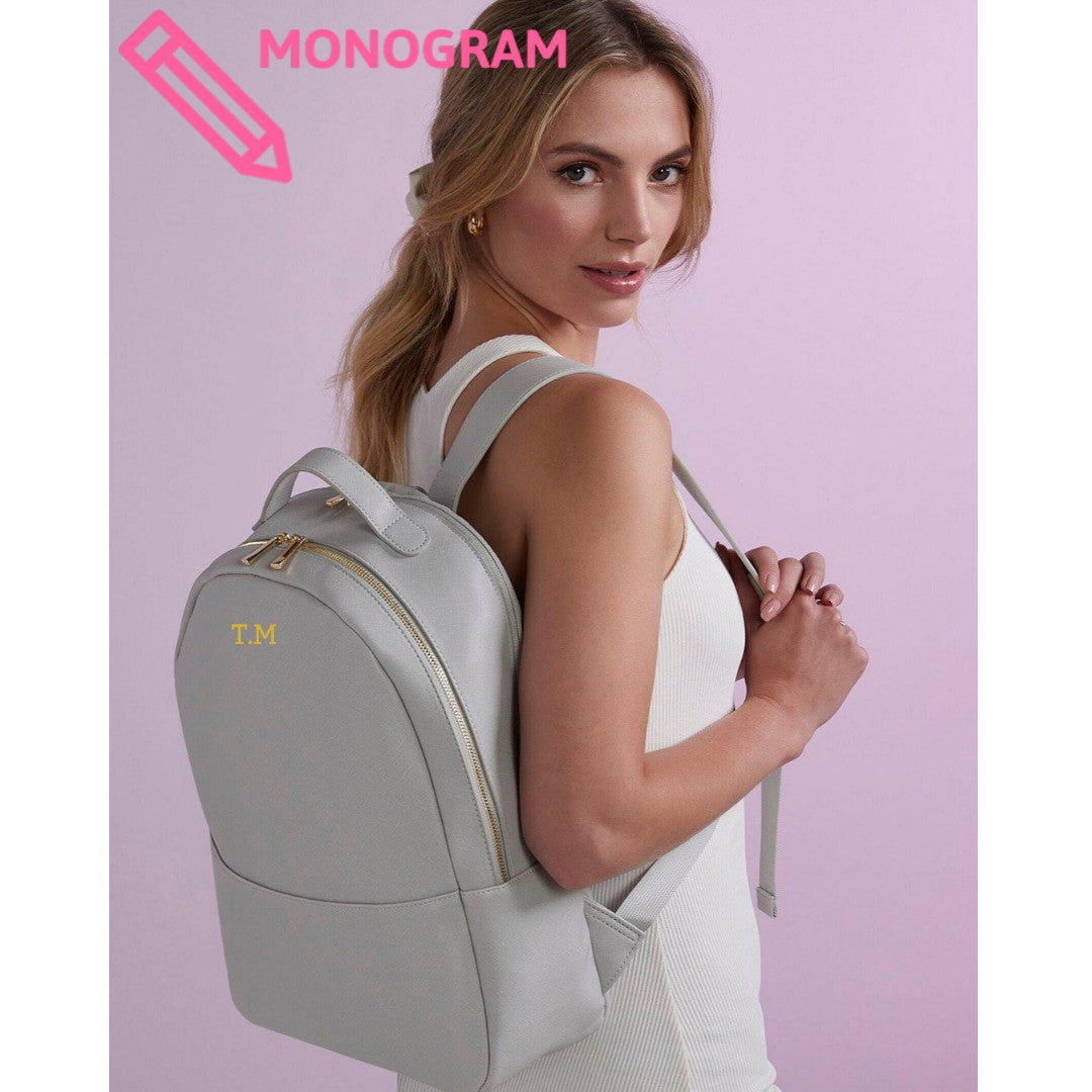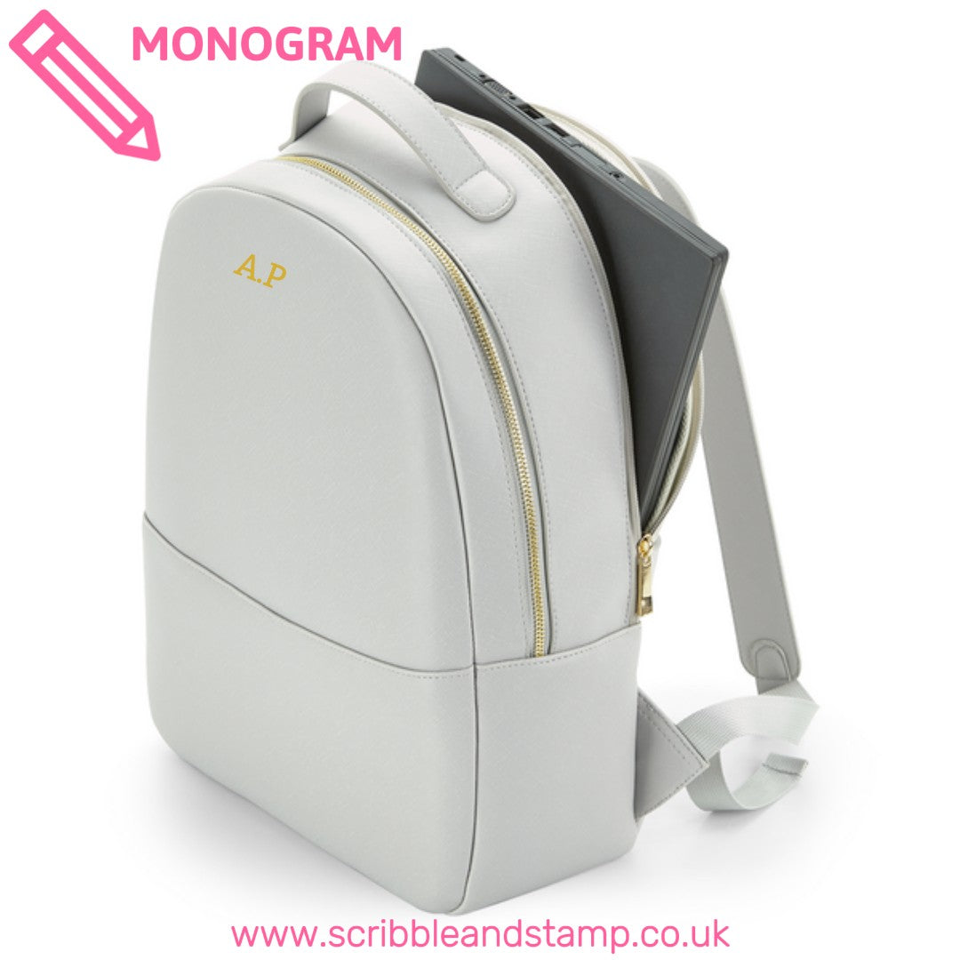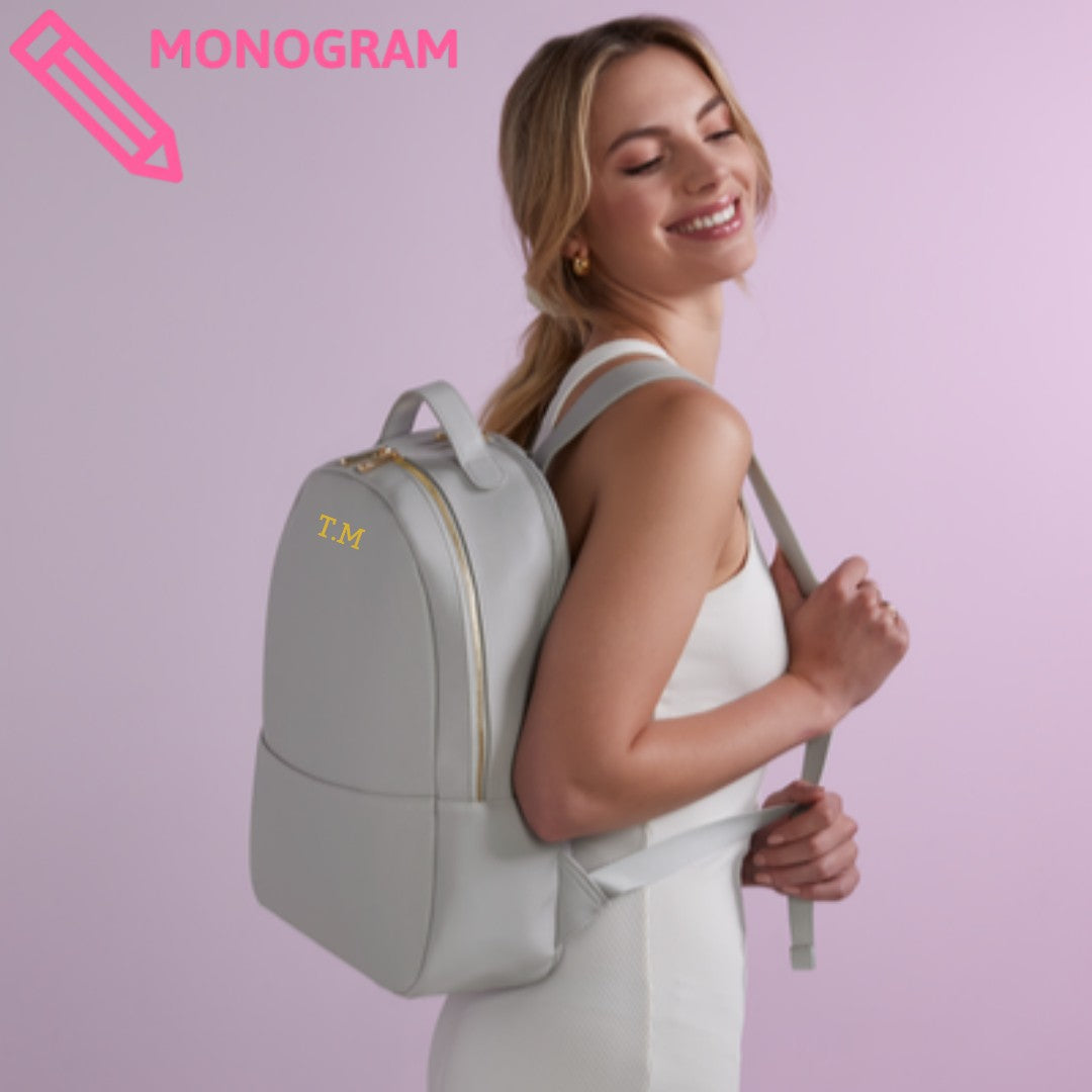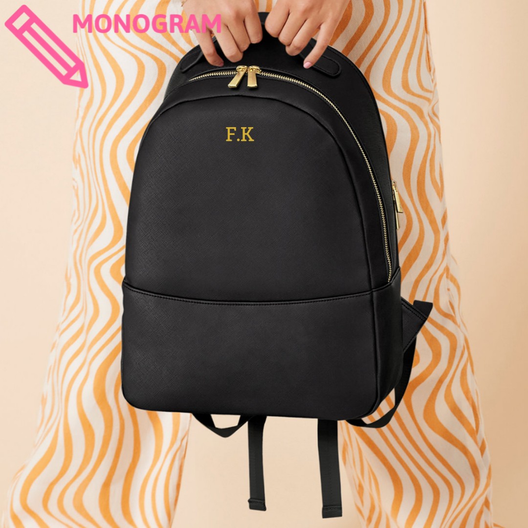 Personalise this backpack with a monogram to make it uniquely yours. Made from durable 100% leather-look fine grain Saffiano fabric with stylish gold accents, it offers a spacious interior with an organiser, secure pocket for valuables, and soft lining. Features include a padded laptop sleeve, zippered back panel pocket, suitcase handle strap and adjustable shoulder straps for comfort and convenience.