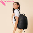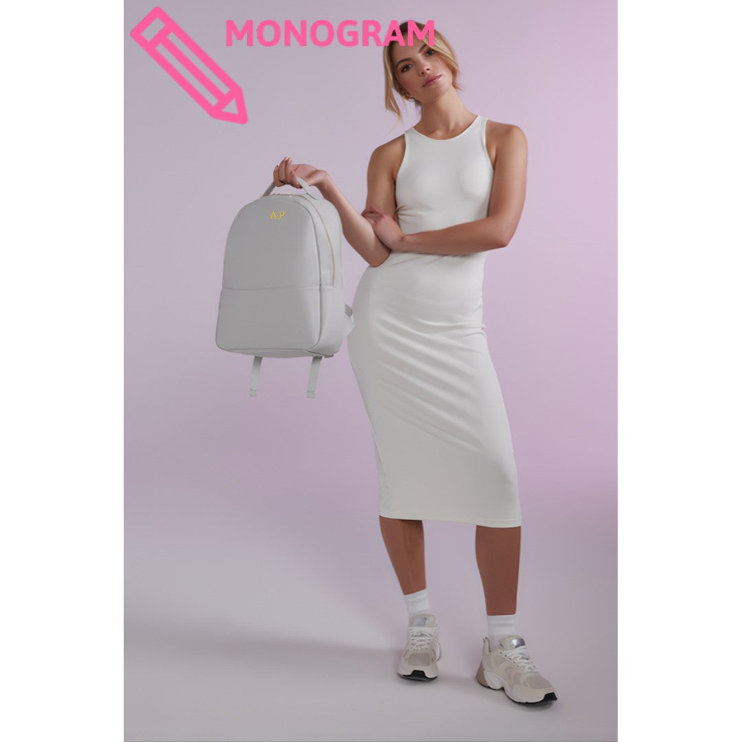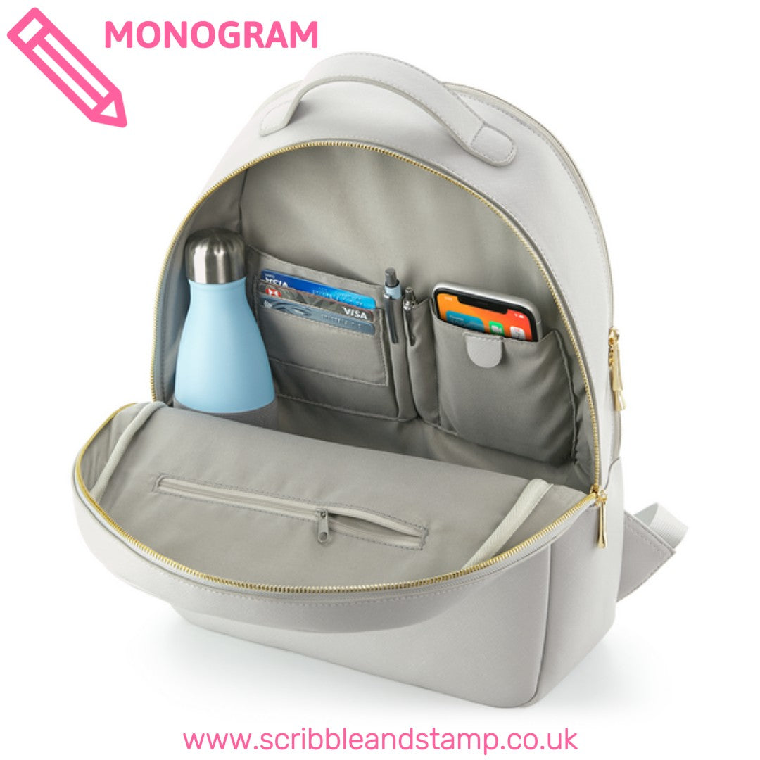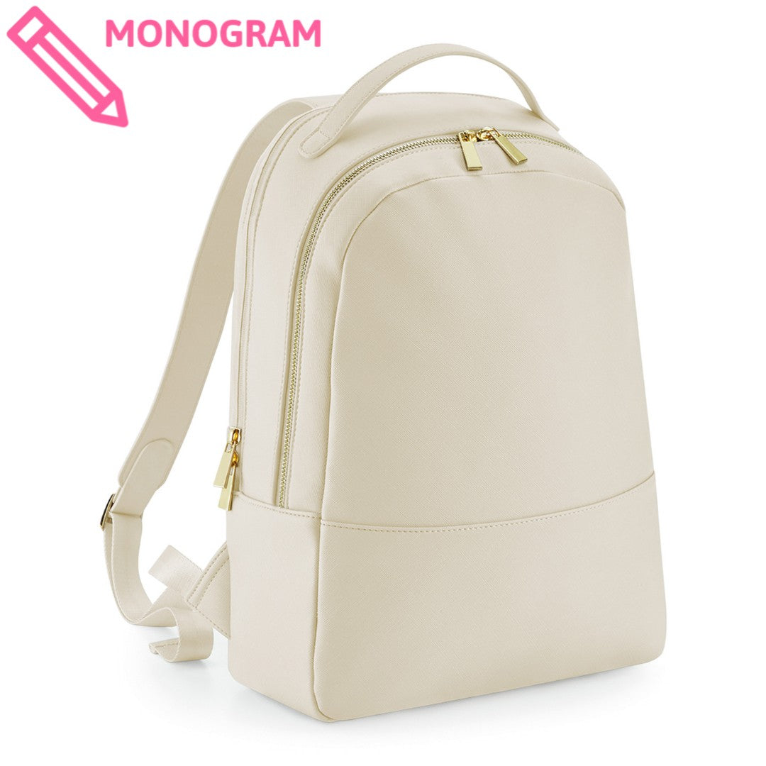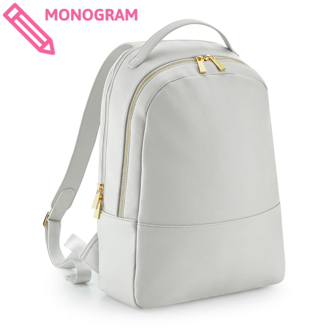 Personalise this backpack with a monogram to make it uniquely yours. Made from durable 100% leather-look fine grain Saffiano fabric with stylish gold accents, it offers a spacious interior with an organiser, secure pocket for valuables, and soft lining. Features include a padded laptop sleeve, zippered back panel pocket, suitcase handle strap and adjustable shoulder straps for comfort and convenience.