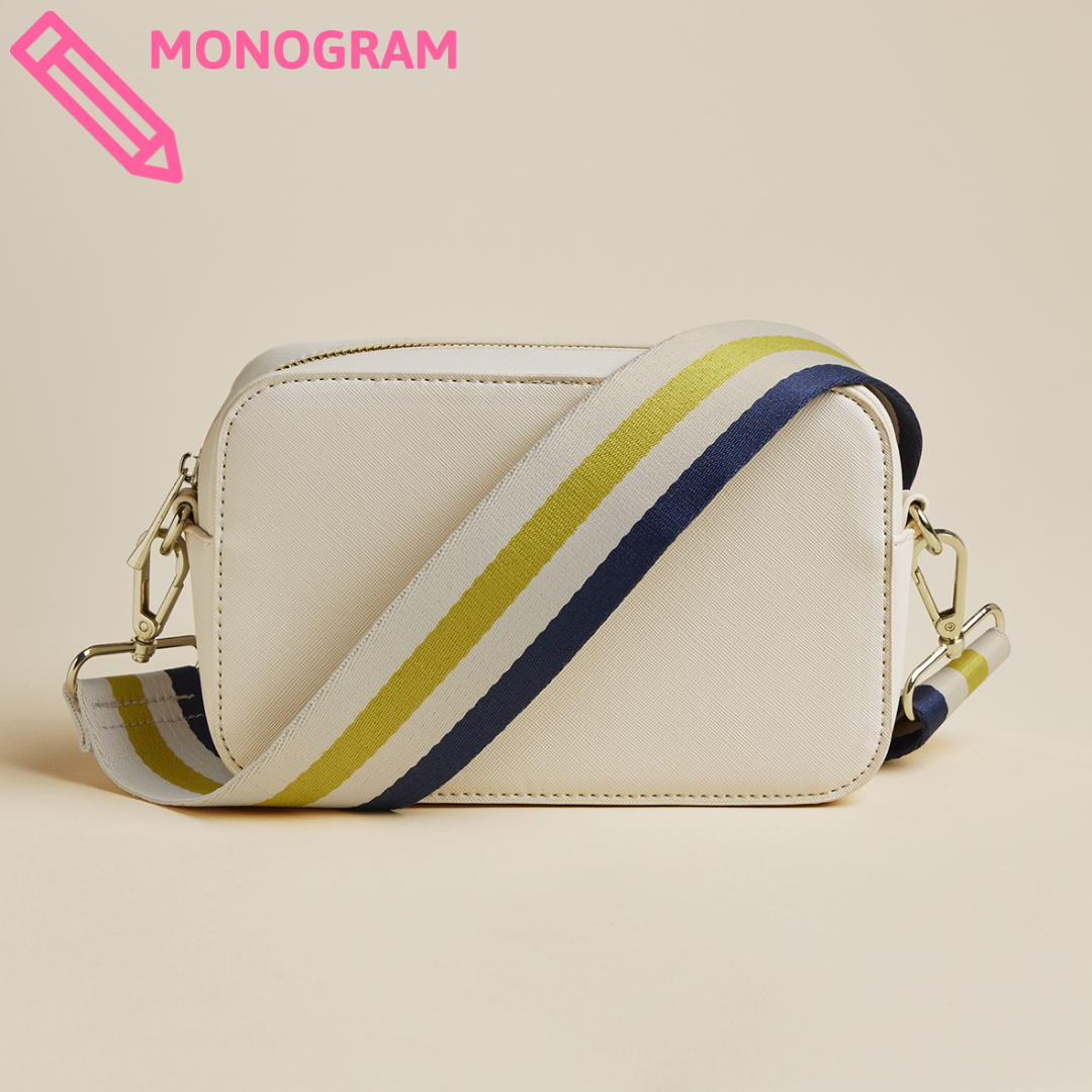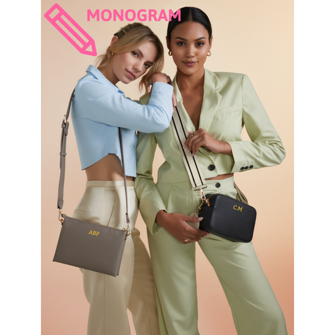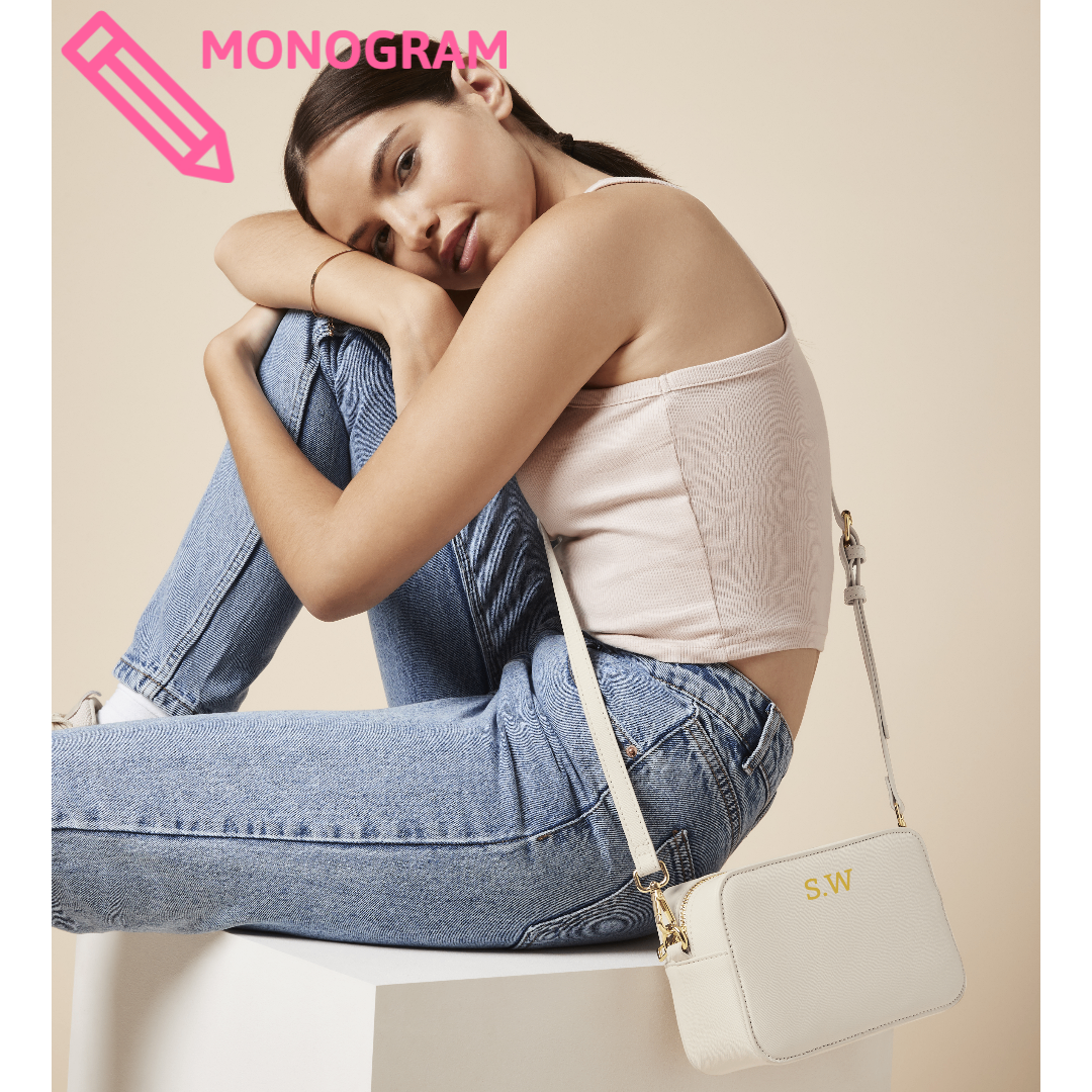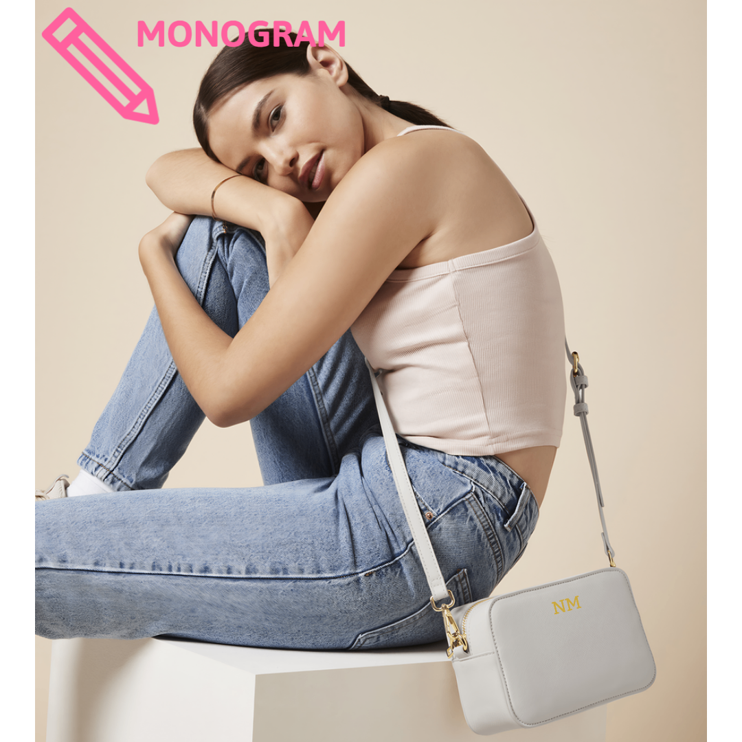 Add a personal touch to the Bansky Cross Body Bag with a custom monogram. Crafted from saffiano fine-grain leather-look material, it boasts a sophisticated, luxurious finish complemented by a soft-touch lining and gleaming gold zippers. Its structured, boxy shape works effortlessly for both casual and evening wear, making it an essential versatile piece. Plus, the interchangeable Bansky Adjustable Bag Strap allows you to easily coordinate it with any outfit.