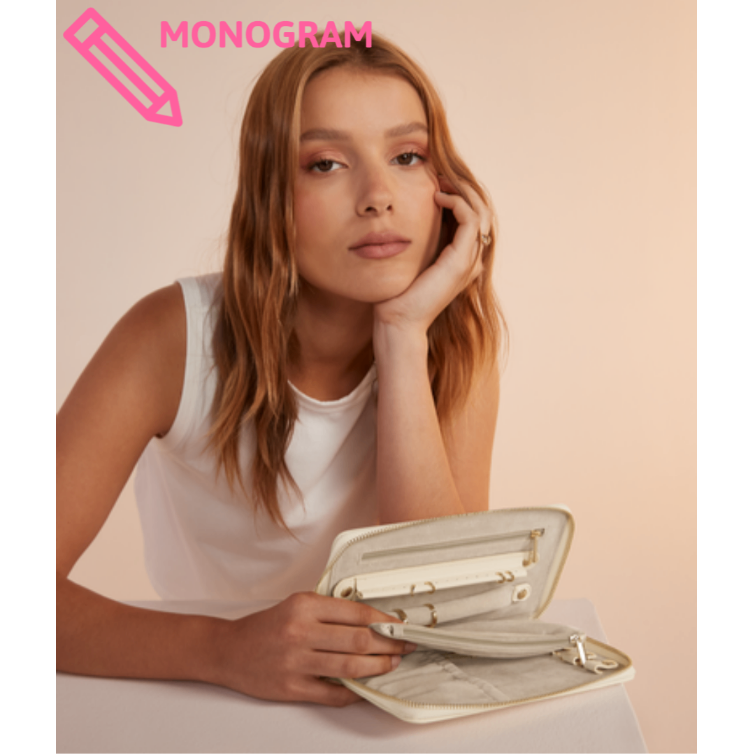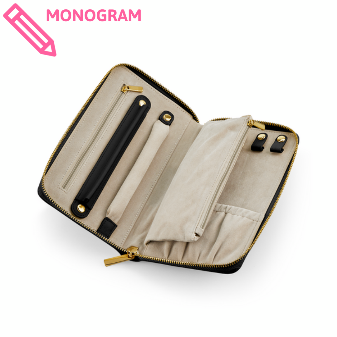 The Bansky Travel Jewellery Case offers a slim, secure way to store your jewellery. With compartments for necklaces, earrings, and rings, plus two zippered pockets, it keeps your accessories organised and protected. Its velvet lining cushions your valuables, and its compact size fits easily in your luggage. Add a monogram for a personal touch—ideal as a stylish and thoughtful gift. This elegant, vegan leather-covered case is perfect for safe, convenient storage at home or on the go.